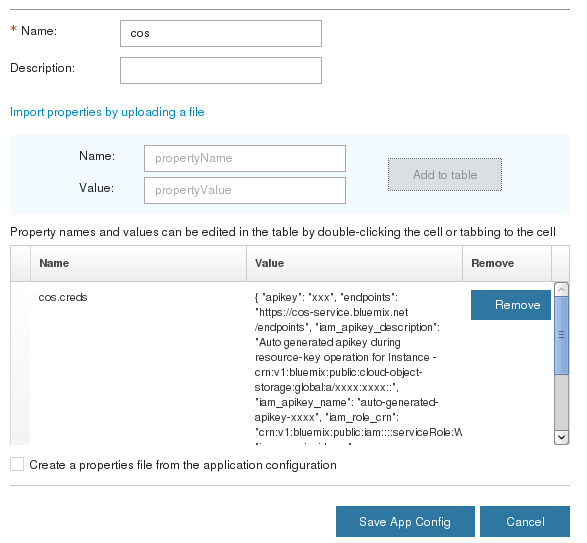 - Create a property in the cos application configuration named cos.creds.