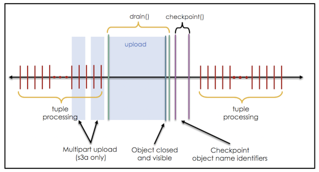 On drain, the operator flushes its internal buffer and uploads the object to the object storage. On checkpoint, the operator stores the current object number to the checkpoint. If the region became inconsistent (e.g. failure causes PE restart), then reset() is called and the operator reads the checkpointed data. In the case the region is resetted after objects have been already closed on object storage, the affected objects are deleted on object storage.