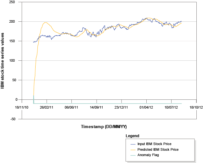 The following graph illustrates the prediction (trend) of stock prices by using the FMPFilter operator. The anomaly flag has a value of 1 when unpredictable data occurs; it has a negative value when the data is not anomalous.