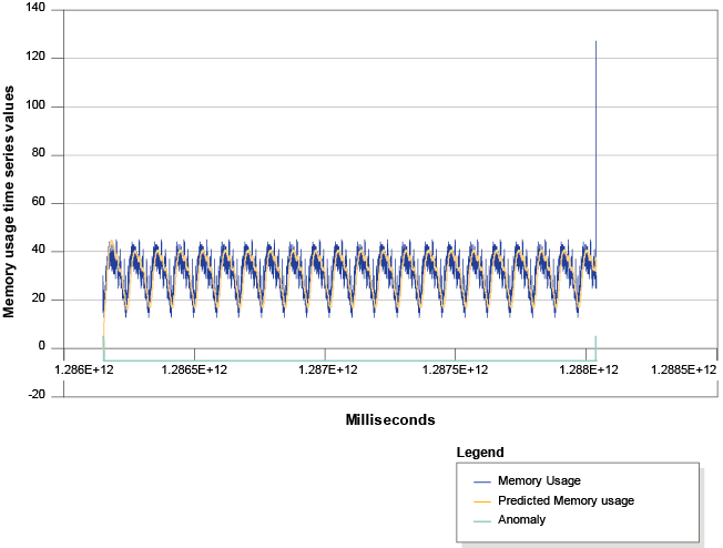 The following graph shows a time series that simulates memory consumption from a computer. The FMPFilter operator is used to track memory consumption and detect anomalies: